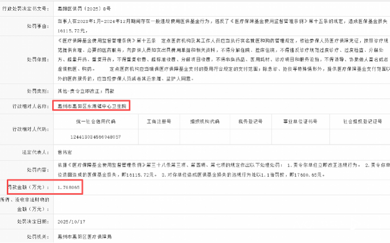 2025-10-23华体会,华体会体育官网,华体会体育,华体会体育APP下载近日,惠州市惠阳区医疗保障局公布了多则行政处罚决定书,惠州市惠阳区淡水街道办事处第一社区卫生服务中心、惠州市惠阳区秋长街道办事处第一社区卫生服务中心、惠州市惠阳区永湖镇中心卫生院、惠州市惠阳区镇隆镇中心卫生院等多家医疗机构,因在2023年1月-2024年12月期间存在一般违规使用医保基金行为,违反《医疗保障基金使用监督管理条例》第十五条规定,造成医保基金损失,被依法处罚。