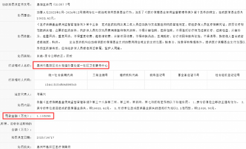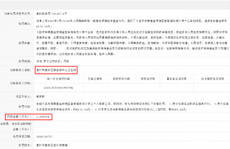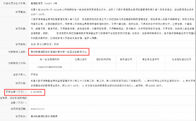 其中,惠州市惠阳区淡水街道办事处第一社区卫生服务中心造成医保基金损失10033.63元,被责令立即改正违规行为、退回损失基金,并被处以1.103699万元罚款;惠州市惠阳区秋长街道办事处第一社区卫生服务中心造成损失13877.80元,被责令改正、退回基金,罚款1.526558万元;惠州市惠阳区永湖镇中心卫生院造成损失16115.72元,被责令改正、退回基金,罚款1.768065万元;惠州市惠阳区镇隆镇中心卫生院造成损失 8172.04元,被责令改正、退回基金,罚款0.898924万元。