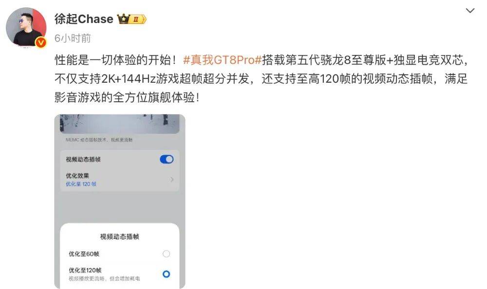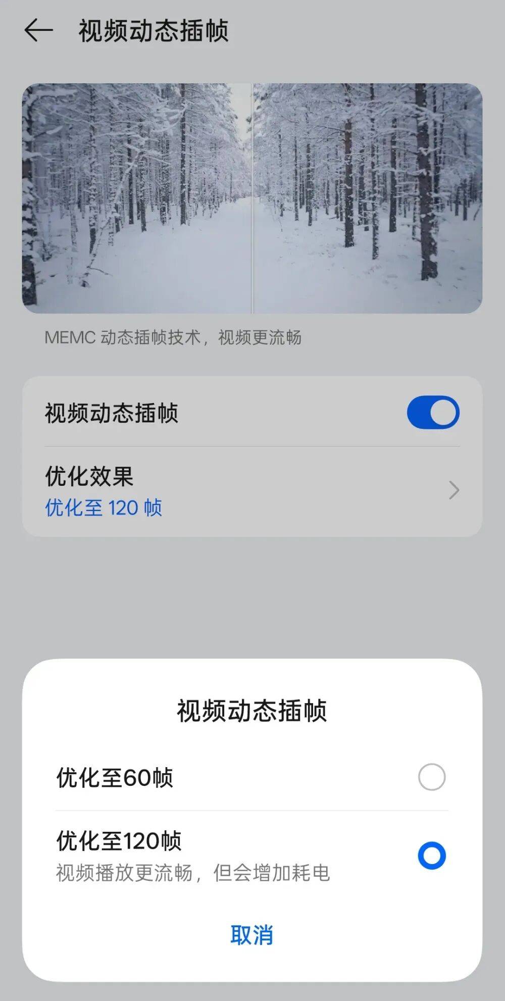 一同展示的页面截图显示了“视频动态插帧”开关,以及“优化至60帧”和“优化至120帧”两个可选项。