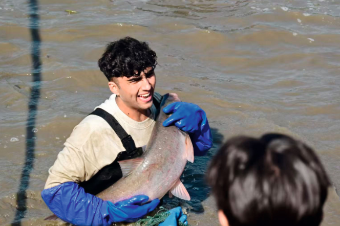 2025年11月21日,巴基斯坦留学生张伟(Huzaifa Muhammad)参加武汉科技大学第11届沁湖鱼宴捕鱼活动(供图武汉科技大学)