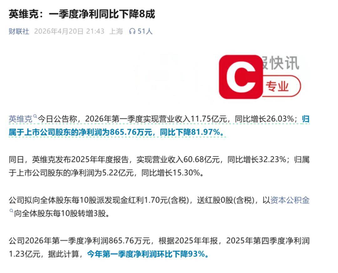 值得注意的是,当前随着一季报的逐步披露,投资者“踩雷”的风险正在加大。最典型的便是AI赛道的液冷龙头英维克,昨晚发布财报称,2026年一季度归母净利润同比下降81.97%,如此直接造成了今日股价的“一字跌停”,收盘后显示还有近60亿元封单,21万股民被埋在其中,着实是苦不堪言;而英维克坐拥1000亿市值,其强烈的负反馈直接带崩了AI算力与液冷方向。