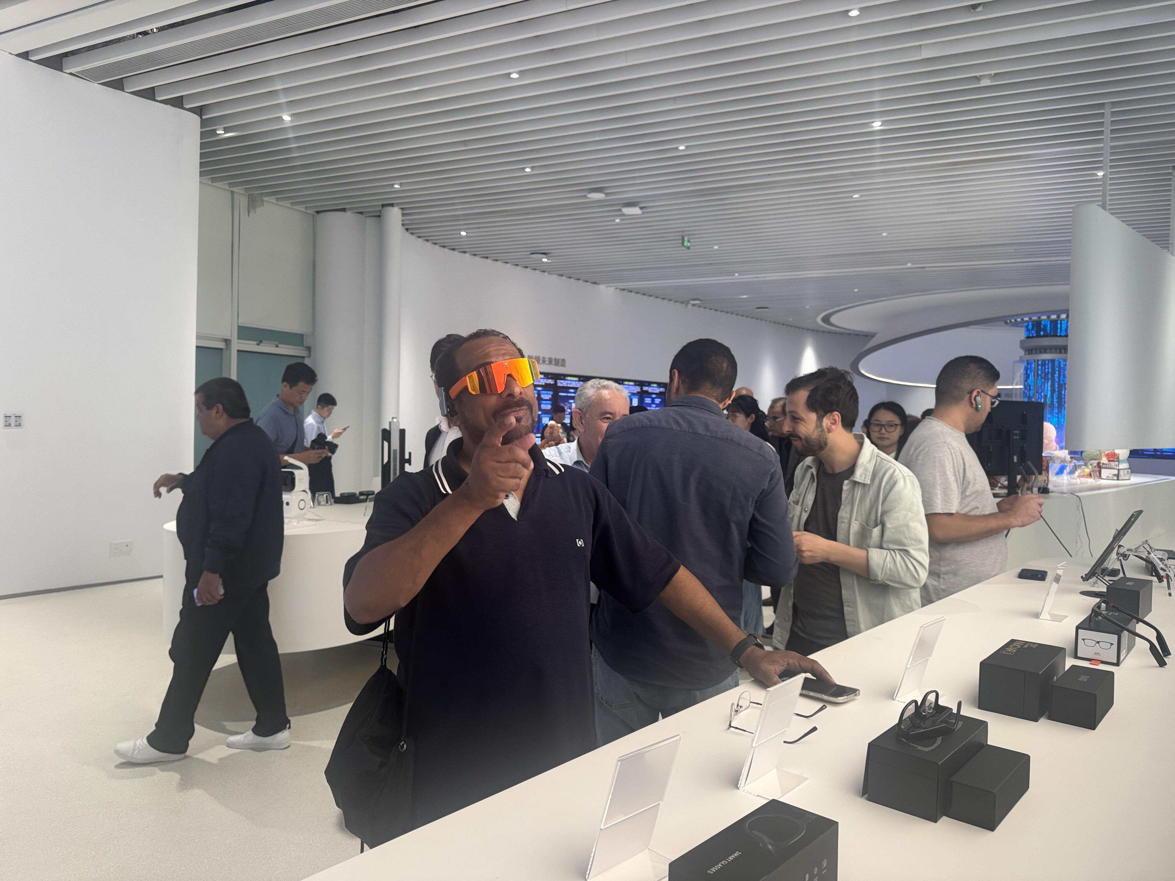 在展厅内,考察团成员纷纷试戴AI智能眼镜,与东莞潮玩AI“小耙”互动对话,饶有兴致地用中文询问它的名字。据介绍,“小耙”是由东莞潮玩企业ToyCity基于原创熊猫IP“耙老师”打造的AI陪伴机器人,毛茸茸的呆萌外观自带治愈感,深受考察团的喜爱。