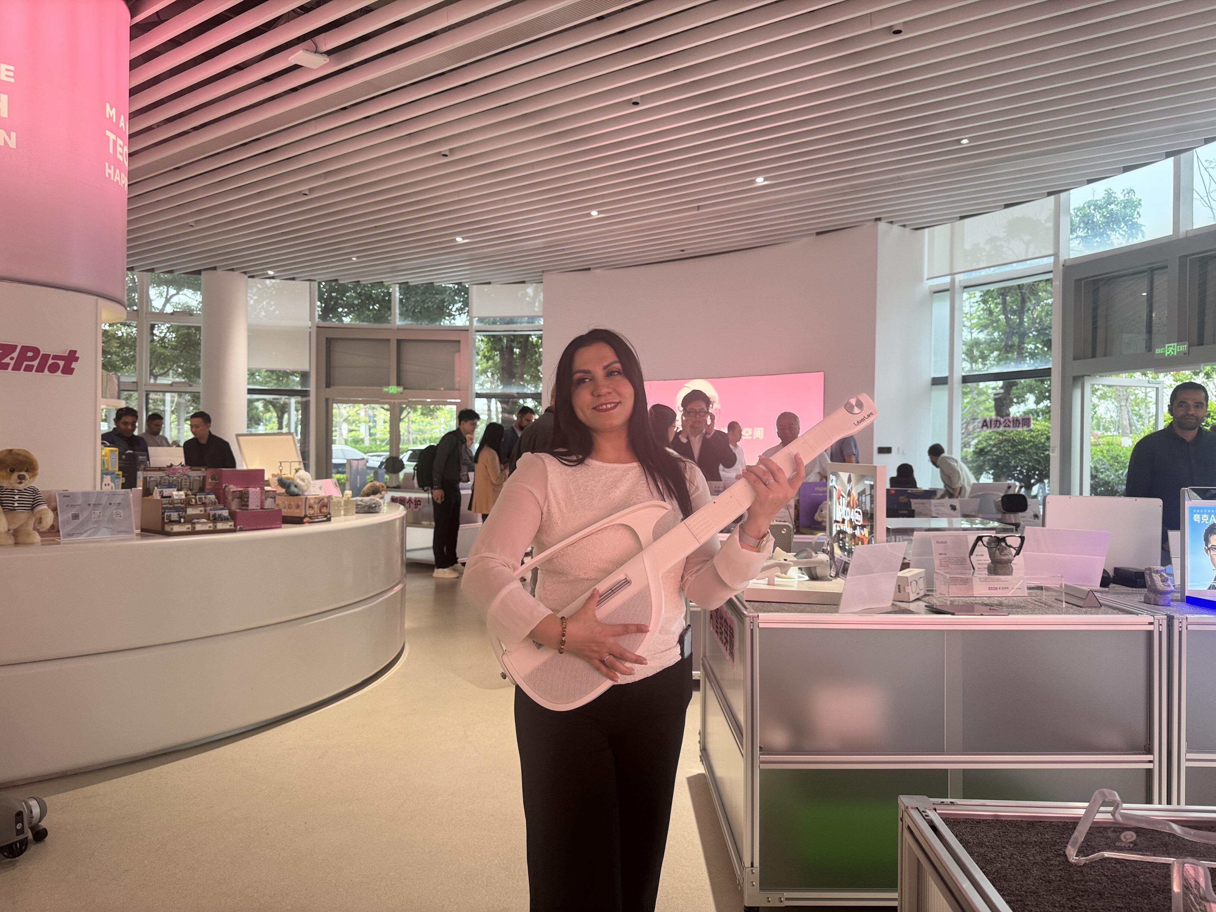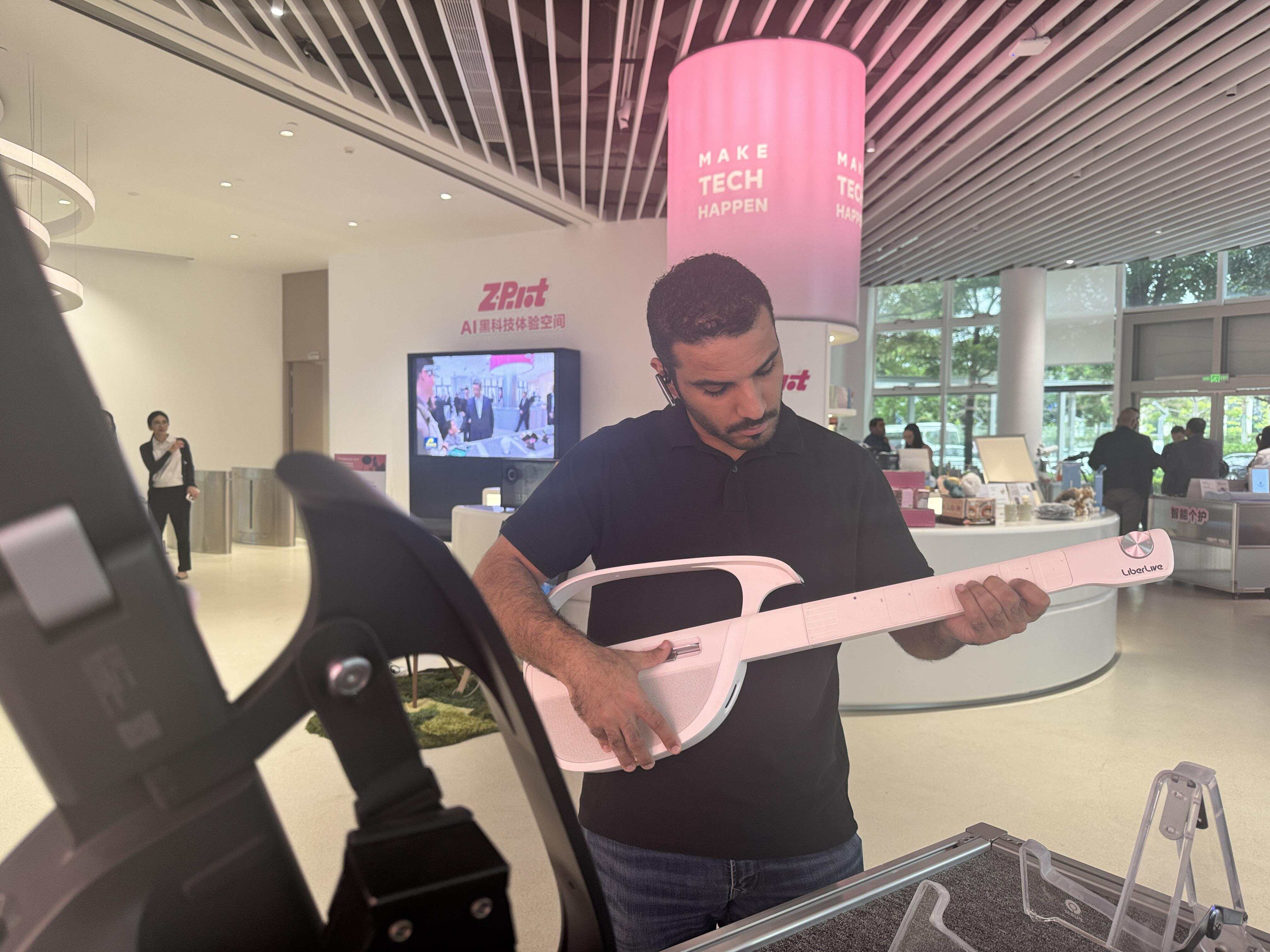 众多成员还在LiberLive无弦吉他前驻足把玩,纷纷上手体验,亲身感受人工智能技术为传统制造业带来的深刻变革与独特魅力。据了解,LiberLive是诞生于东莞的音乐科技品牌,也是“无弦吉他”品类的全球开创者,曾登上央视舞台,并入选《时代》杂志年度发明。